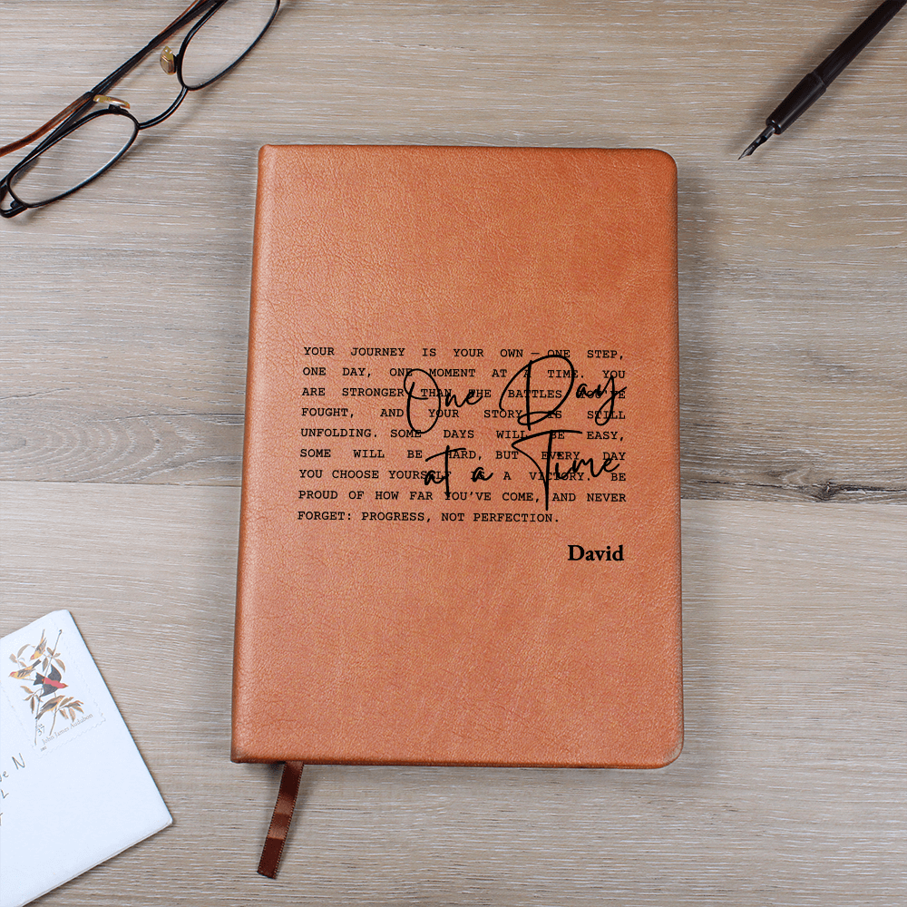 Encourage strength, reflection, and resilience with this Personalized Sobriety Journal. Featuring the uplifting phrase โOne Day at a Timeโ on the cover, this vegan leather journal makes a thoughtful gift for sobriety milestones, anniversaries, or encouragement along the recovery journey.