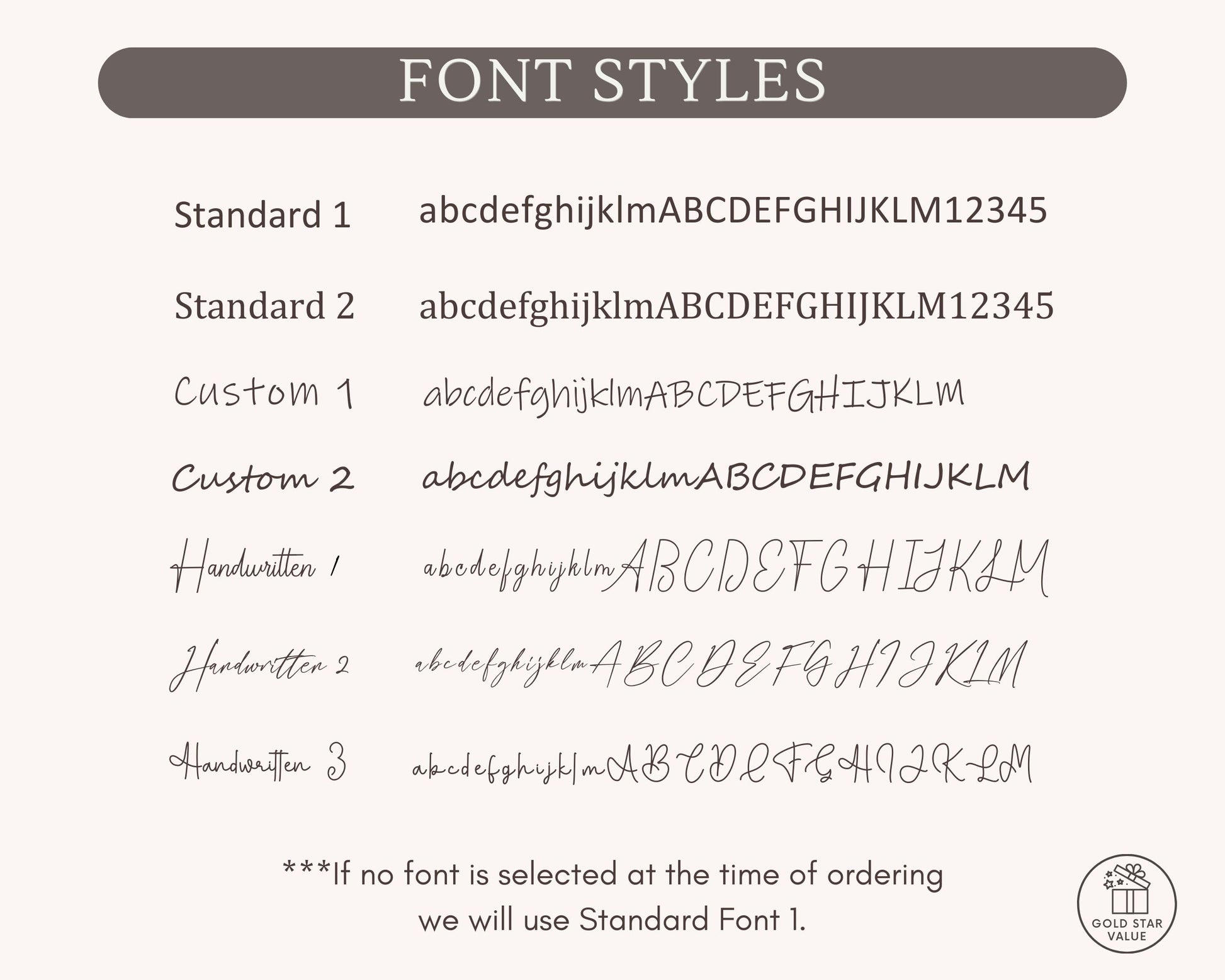 Please ensure your message does not exceed 50 characters, as this is different from 50 words. See listing photos for font options.