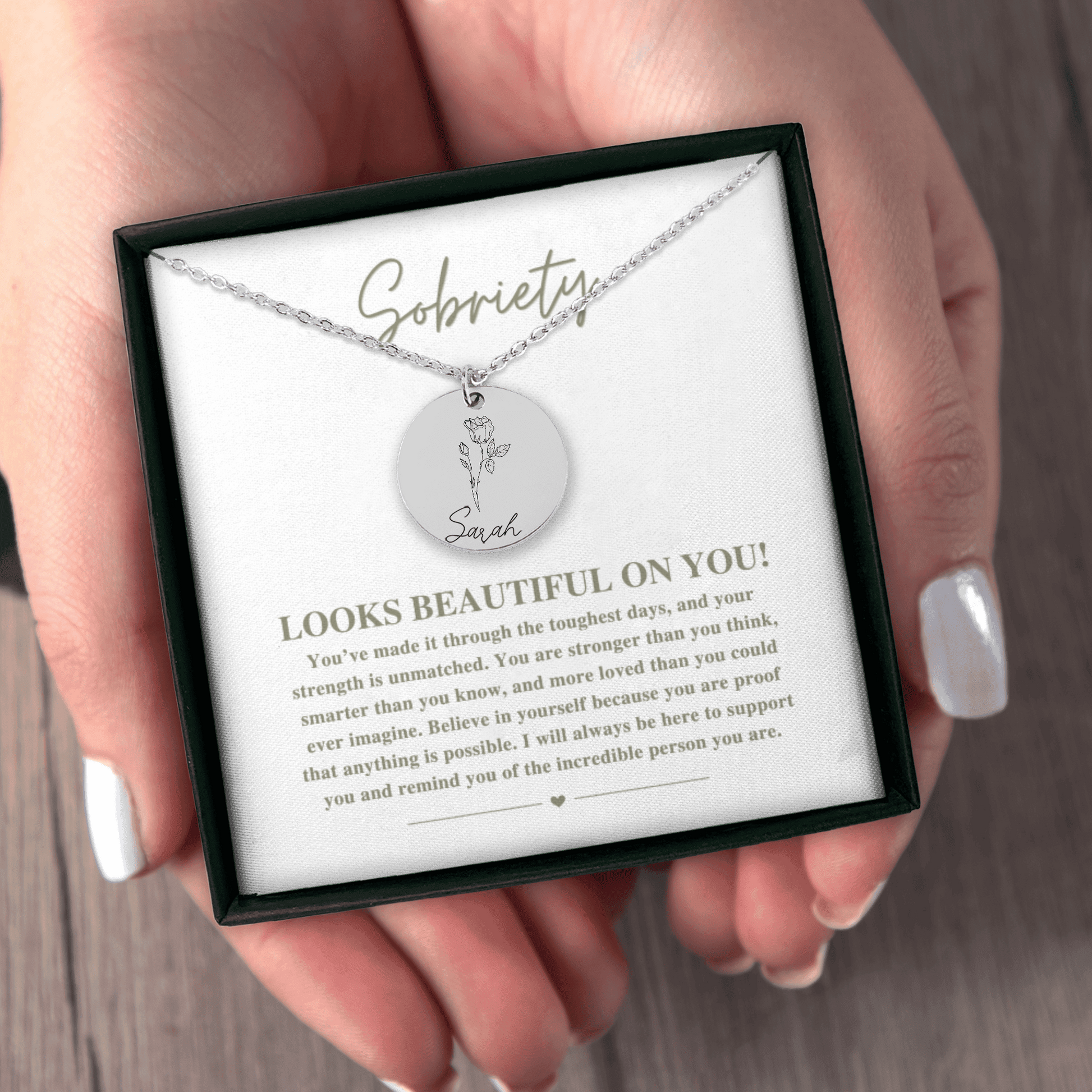 Celebrate her incredible journey in recovery with this Personalized Sobriety Birth Flower Necklace. Engraved with her birth flower and name on the front, this meaningful piece honors her strength, resilience, and sobriety milestones.