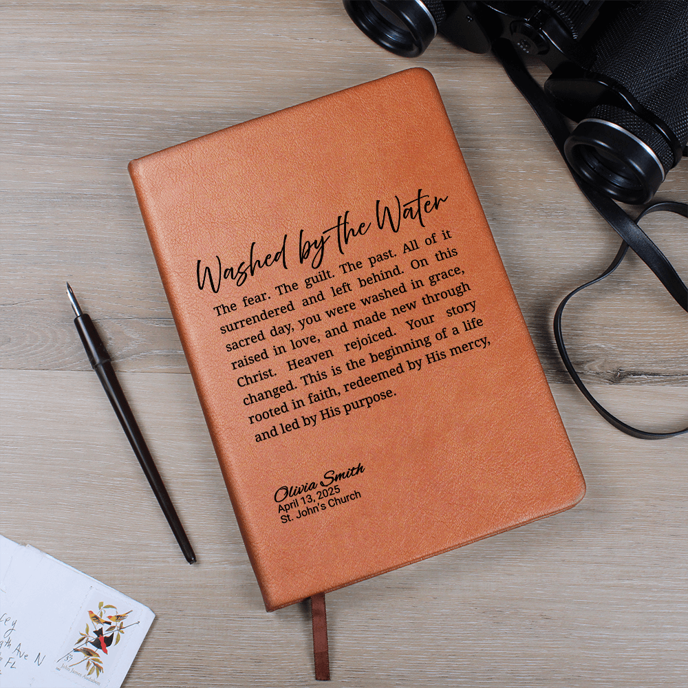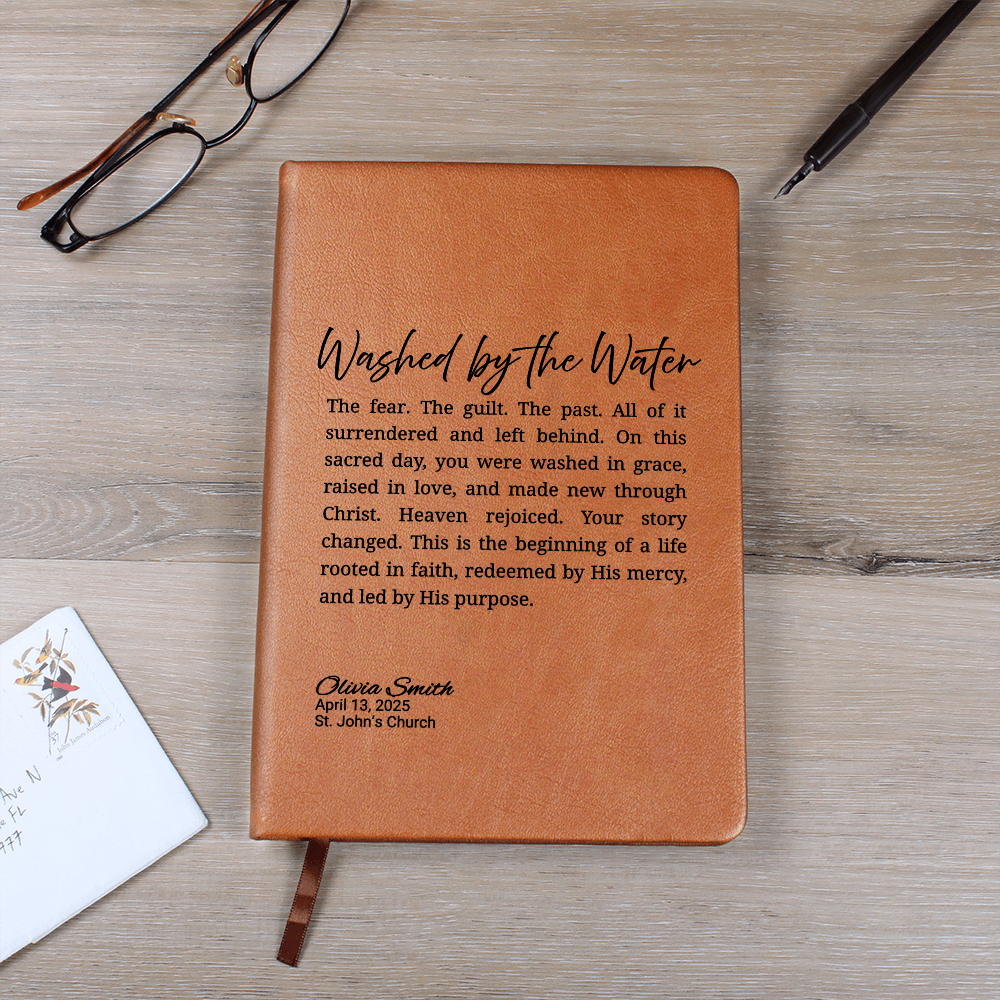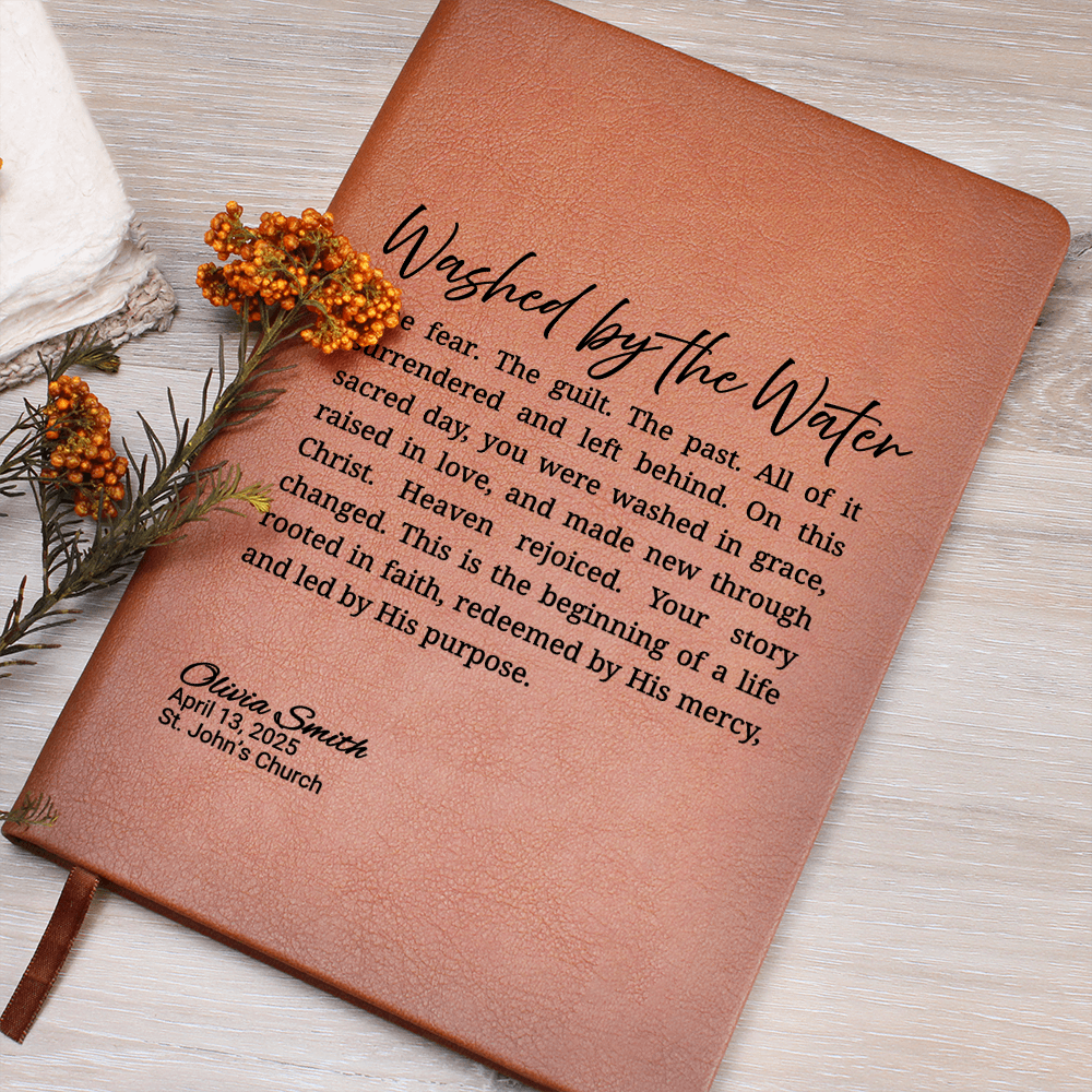 Mark the joy of baptism with this Washed by the Water Journal, a meaningful keepsake that symbolizes renewal and faith. Personalized with the recipientโs details, this vegan leather journal is perfect for recording prayers, reflections, and milestones on the spiritual journey ahead.