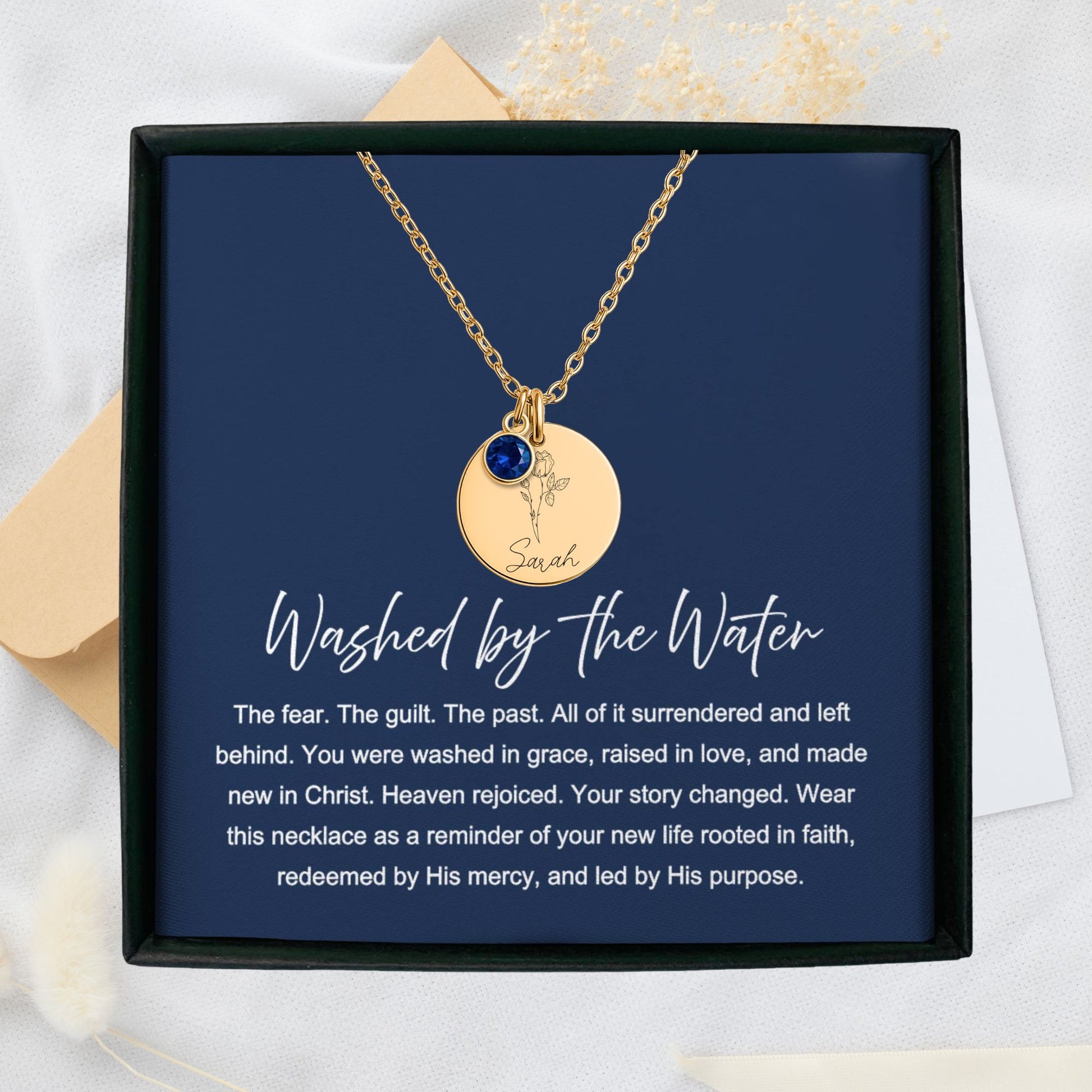 Celebrate the joy of baptism with our Washed by the Water Necklace, a meaningful keepsake that symbolizes renewal and faith. The pendant is personalized with the recipient’s birth flower and name engraved on the front, paired with a sparkling birthstone charm. For a special touch, you may add a custom back engraving — such as a baptism date, church name, or short message (up to 50 characters).